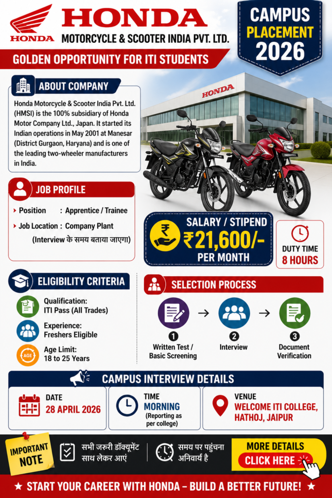 Honda Motorcycle Campus Placement 2026 | ITI Pass Company Details :- Honda Motorcycle & Scooter India Pvt. Ltd. (HMSI) 👉 […]