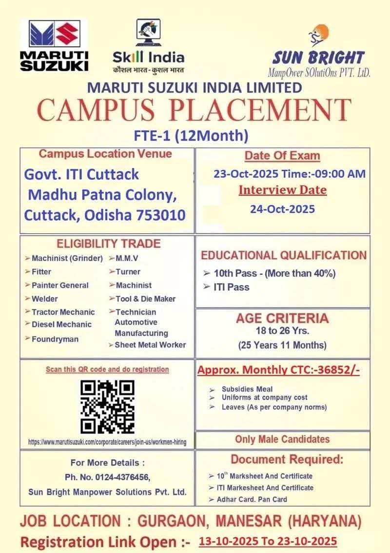 Maruti Suzuki Campus Placement 2025 | FTE | ITI Pass